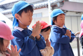 鳥居をくぐる時しっかりお辞儀をする子どもたち。「神様のお家なんだよね!」と背筋が少し伸びていて顔もキリッとしていた様子。園長先生から七五三の由来や千歳飴の意味などを聞いていざお参りへ。上の子は下の子の面倒を下の子は上の子を見て真似っこを。お参りする後ろ姿に成長を感じました。