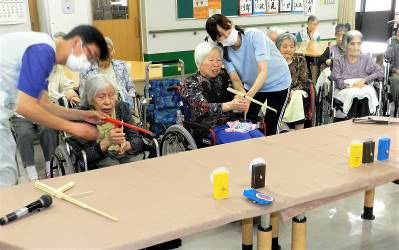 新型コロナウィルスの影響で、外出やボランティア訪問が自粛となりました。利用者様にとって楽しんでいただけるものは何かと、毎月の誕生会の担当者が趣向を凝らした出し物を考え射的、玉入れ、靴飛ばし(スリッパ)など子供のころやっていたものや、風船おはじき、二人羽織、手作りパフェなど、誕生者の方々も一緒に参加して頂きました。