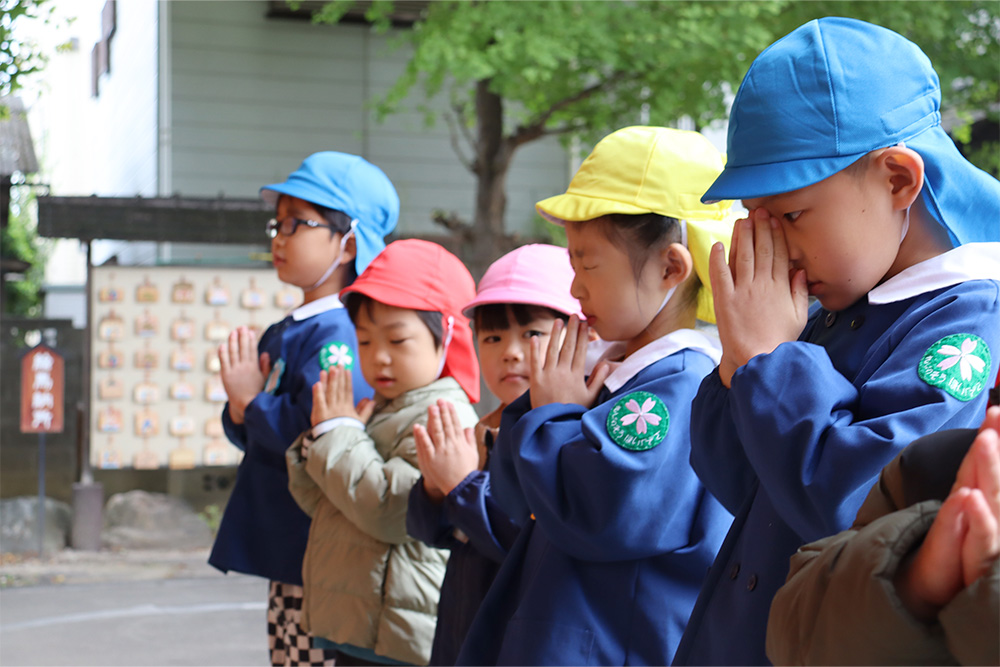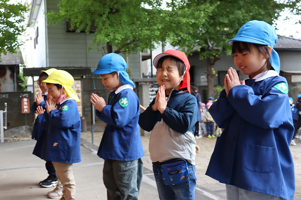 鳥居をくぐる時しっかりお辞儀をする子どもたち。「神様のお家なんだよね!」と背筋が少し伸びていて顔もキリッとしていた様子。園長先生から七五三の由来や千歳飴の意味などを聞いていざお参りへ。上の子は下の子の面倒を下の子は上の子を見て真似っこを。お参りする後ろ姿に成長を感じました。