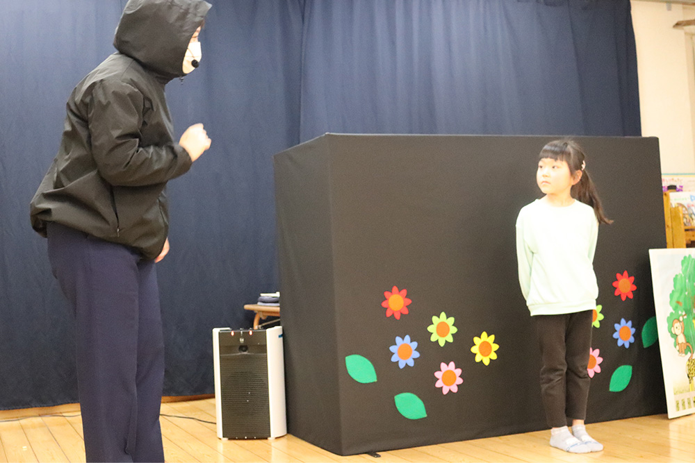 その後は不審な人に遭遇した場合、自分の命を守るためにはどのように行動したらよいかをパペットシアター人形劇を通して4つのお約束事を学びました。話をよく聞いていた子どもたちはまた一つ学びを深め、お約束を守って安全に過ごすことができるでしょう。