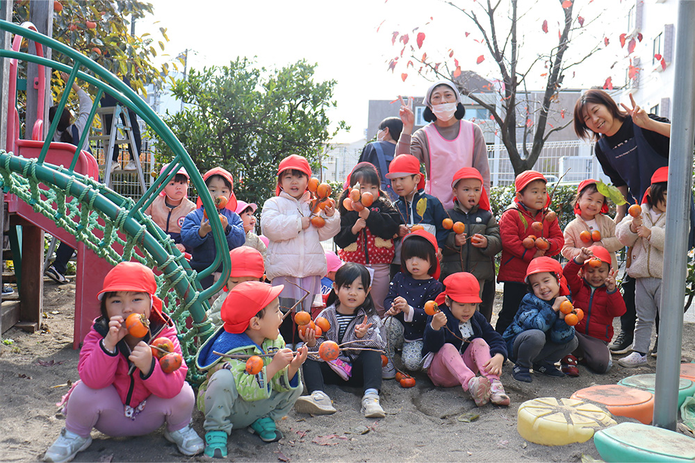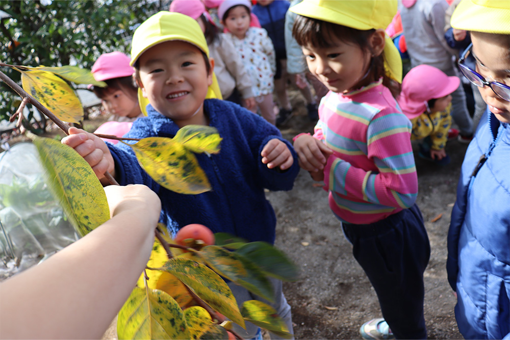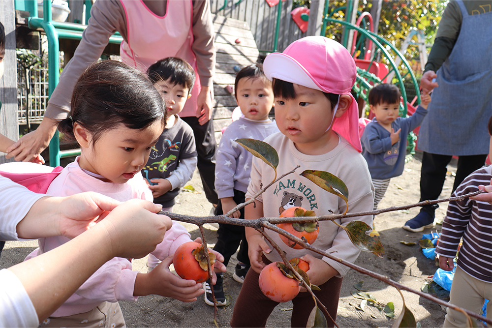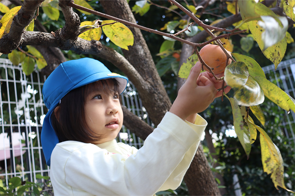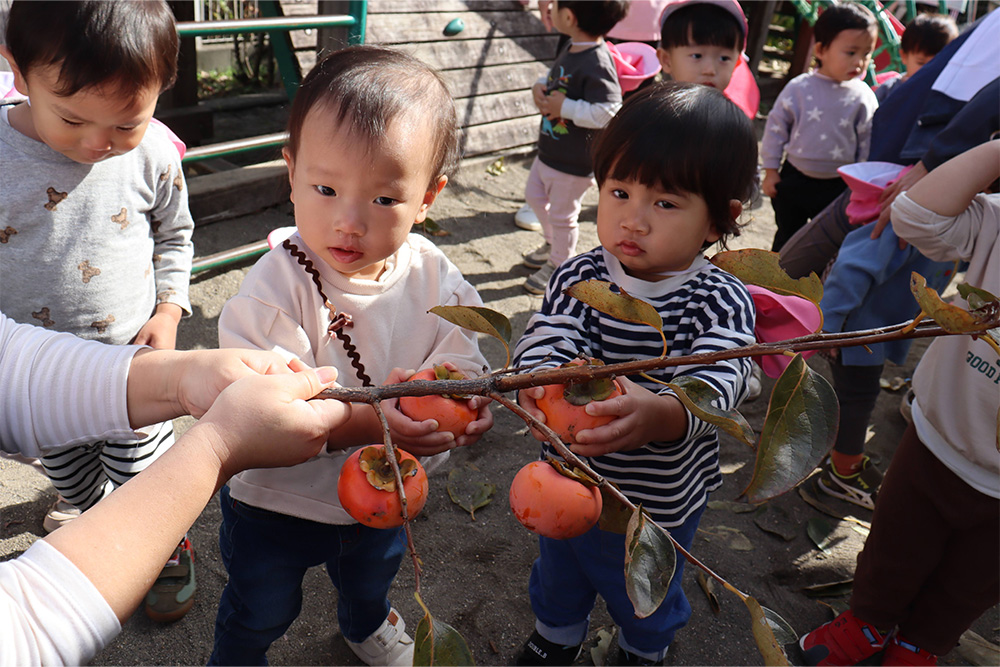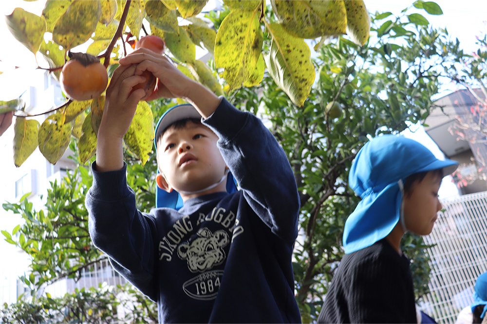 今年は太陽の光をたくさん浴びて育った柿が数多く実り、今か今かと収穫を楽しみにしていた子どもたちでした。枝に付いた柿を一つ一つ丁寧にもぎ取り、「美味しそう!」とつぶやきながら、みんなで収穫を楽しみました。