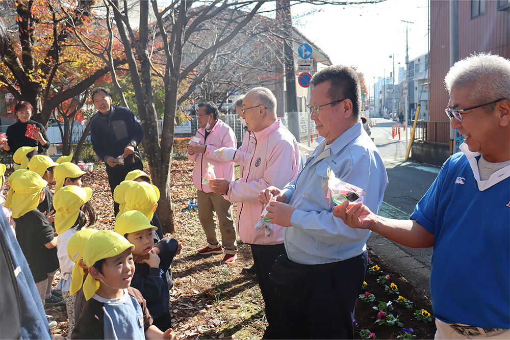 花壇いっぱいのパンジーをみて「きれいだね!」と喜ぶ子どもたち。最後にはご褒美をいただき、こちらからもプレゼントをお渡しし、素敵な時間を過ごすことができました。
