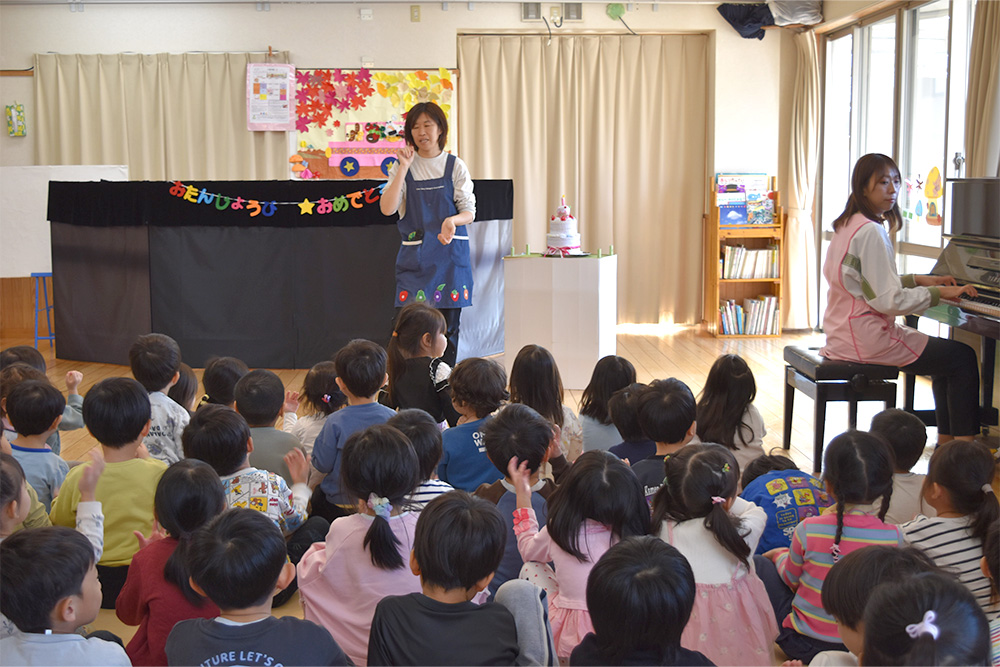 幼児組は5名のお友だちをお祝いしました。 先生からの演し物は、やおやのパネルシアター。「やおやのお店に並んだ〜♪」と歌いながら、八百屋さんにあるものないものを当てていくゲーム。パン屋さんバージョンでは「パンダ?!」と大盛りあがり☆最後は野菜とお肉なども組み合わせて、美味しそうなパンが完成しました。