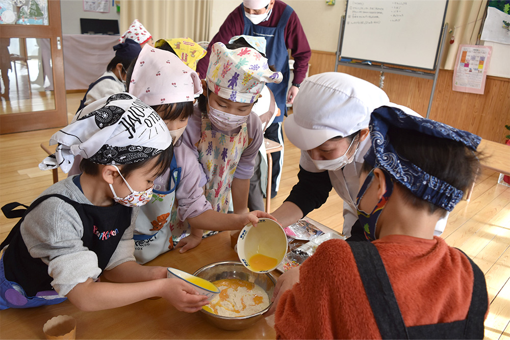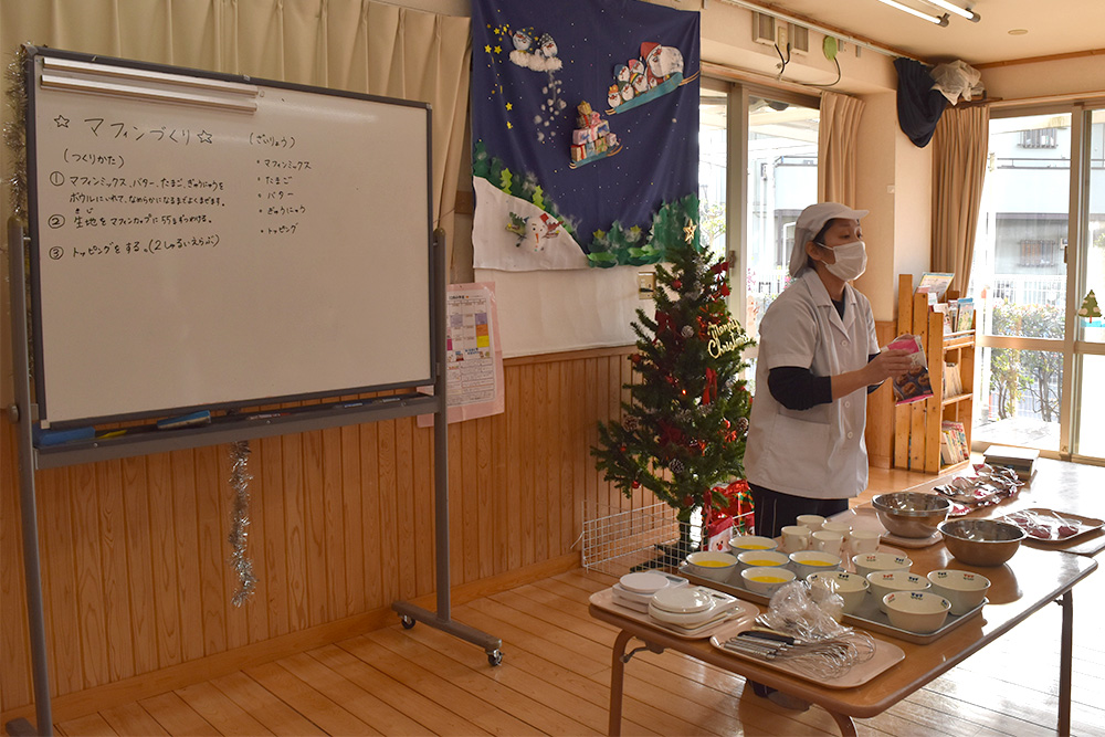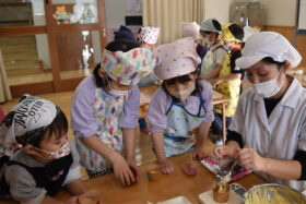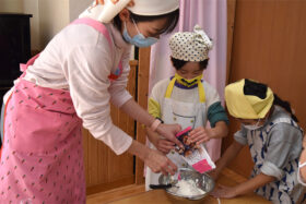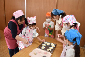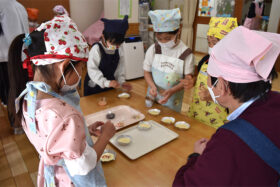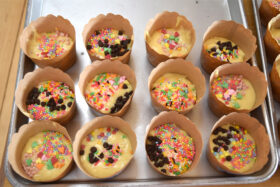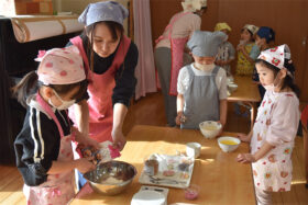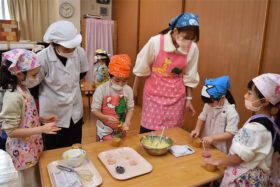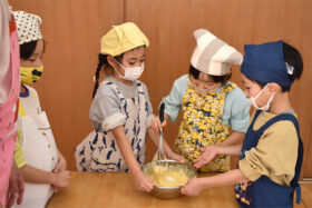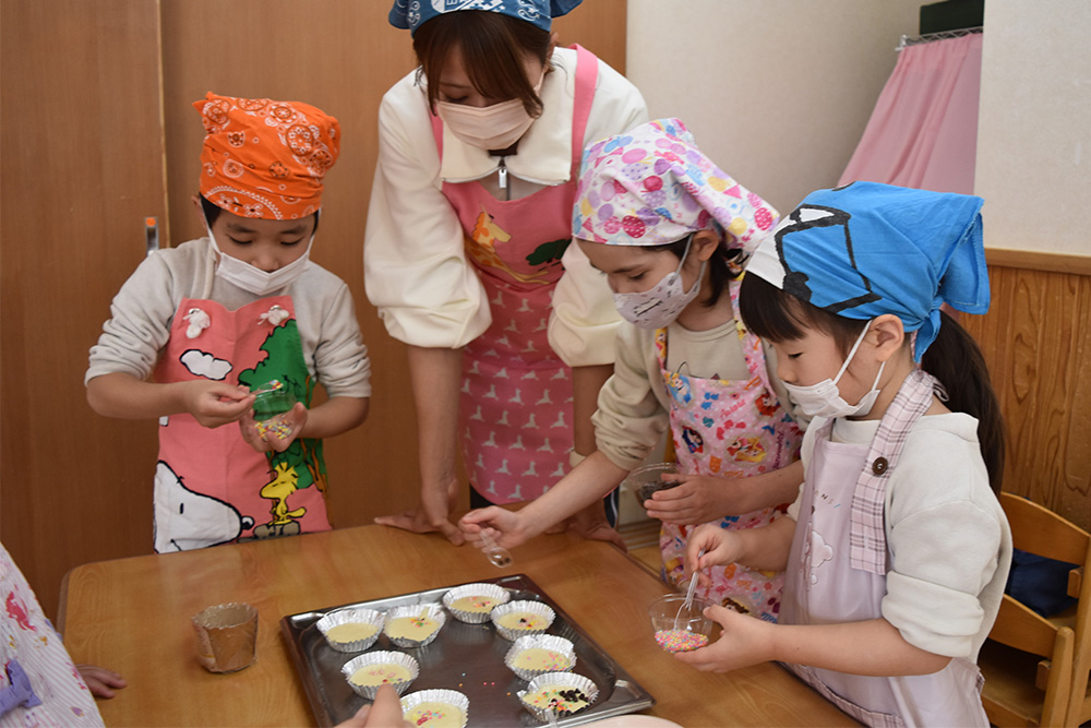 材料を分担し、一つずつボールに入れ、1人ずつ心を込めて生地を混ぜていきました。カップに入れてお楽しみのトッピング!7種類もあるトッピングに「どれにしよー!」と目がキラキラ!もも組うめ組さんのトッピングを終えて先生方と自分のトッピング。「なにをトッピングしたらかわいいって喜んでくれるかな。」などの声もあがりました。
