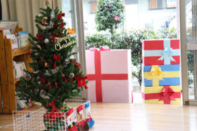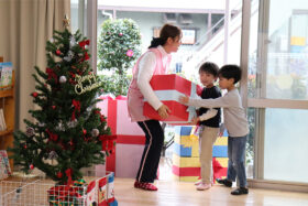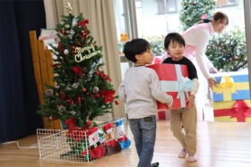 その後、クラスに戻り、一人ひとりがプレゼントを受け取ると、嬉しそうに大切そうに抱える姿が見られました。心あたたまるひとときを過ごし、素敵なクリスマス会となりました。