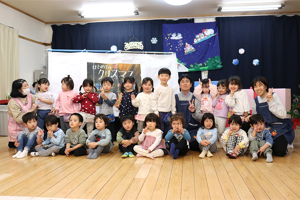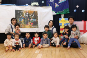 全クラスが集まり、絵本『はじめてのクリスマス』を聞きながら、クリスマスのあたたかい気もちをみんなで感じました。お話の余韻が残る中、鈴の音が聞こえ、プレゼントを見つけた子どもたち。「サンタさん、ありがとう!」と感謝の気持ちを声にして伝える姿が、とても印象的でした。