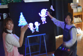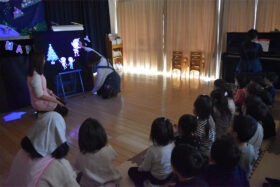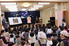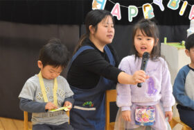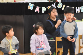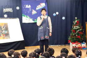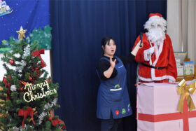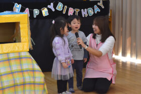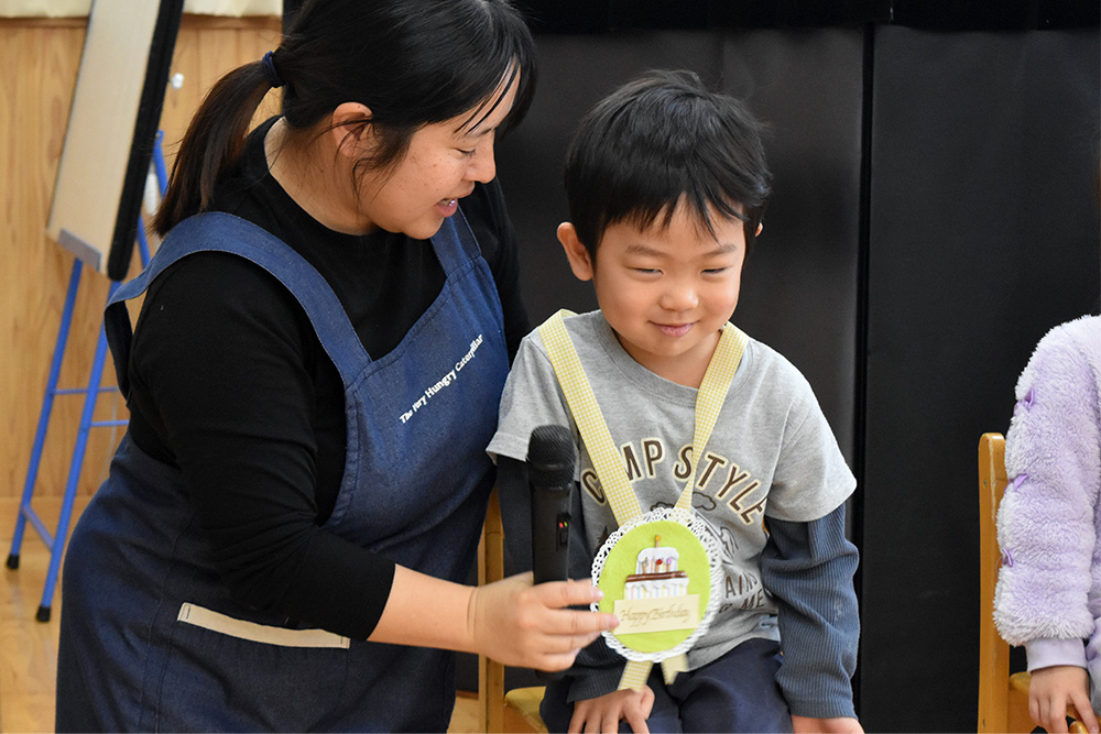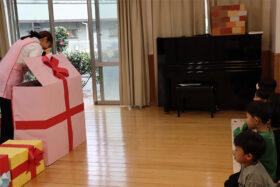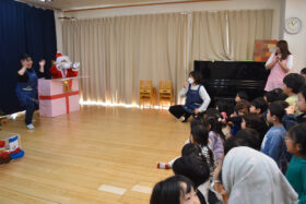 先生たちからの演し物は、『箱の中身はなんでしょう?』クイズ!誕生月の子どもたちが箱の中に入っているケーキの材料を当て、最後の答え、ロウソクもみんなで当てて素敵なケーキが完成!大喜びの子どもたちの前に、今度は大きなプレゼント箱が登場。中からサンタさんが現れると、会場は笑顔と歓声に包まれました。