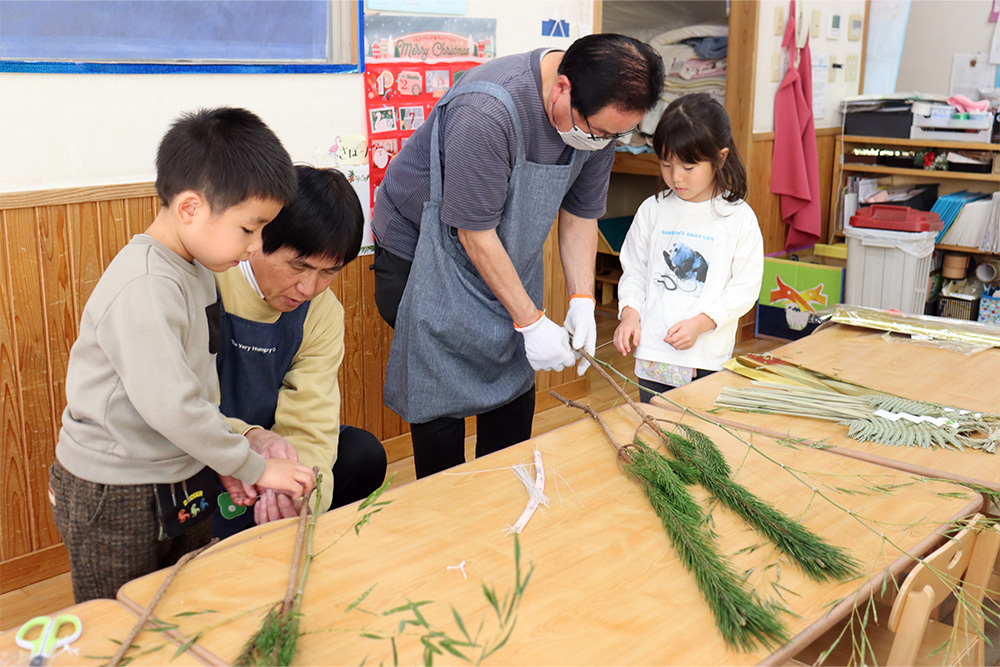 26日( 金)、園長先生とさくら組のお友だちが門松作りを行いました。