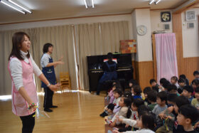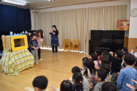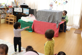 先生たちからの演し物は、『アンパンマンのまちがえ探し』のペープサートでした。ジャムおじさんがパンを作ったのに、あれ?いつものアンパンマンとお顔がちが〜う!!どこがちがう?と保育者が問いかけると「おかおがちがうよ!」「くつがちがうね!」と大好きなキャラクター達に大興奮でした。