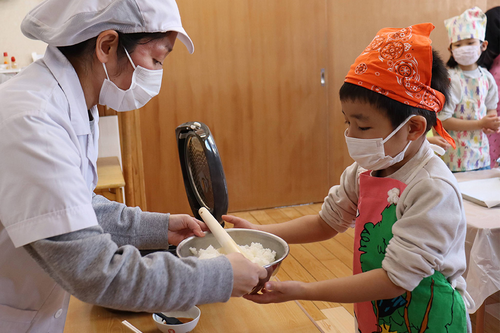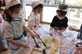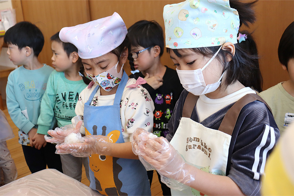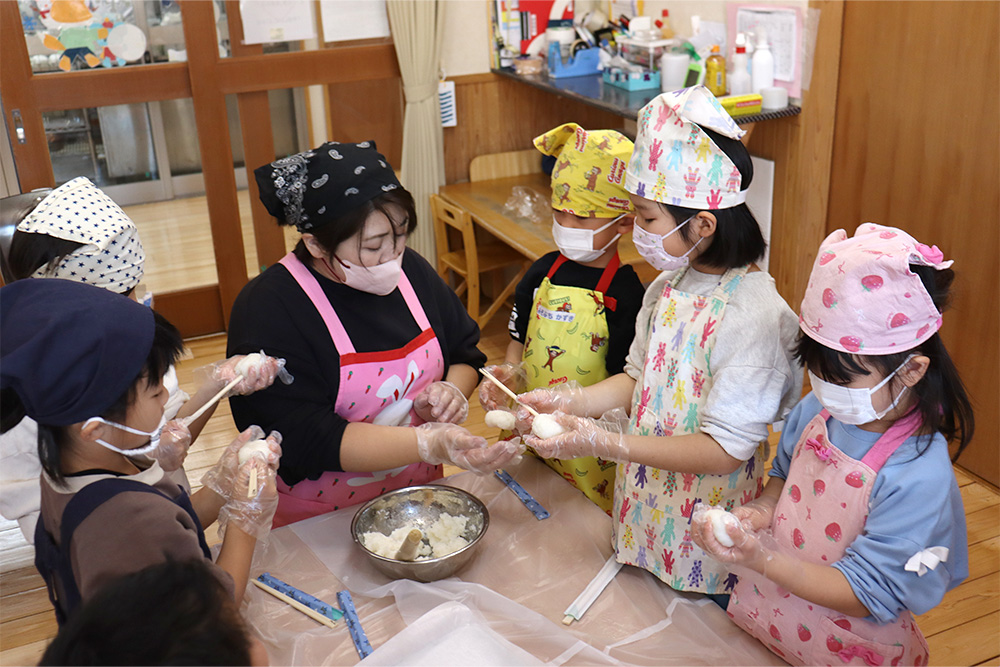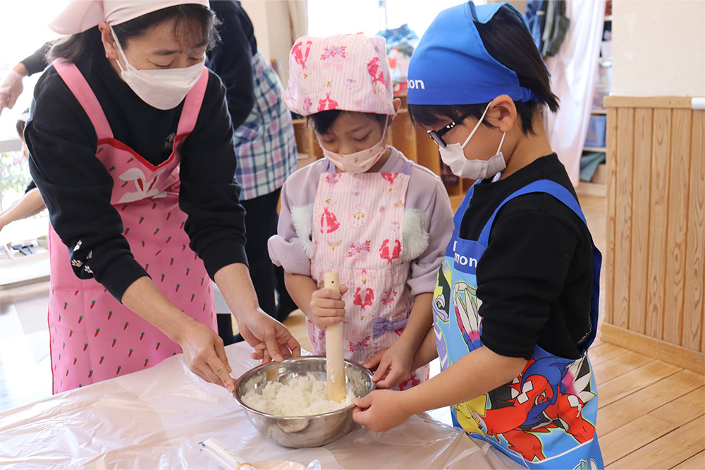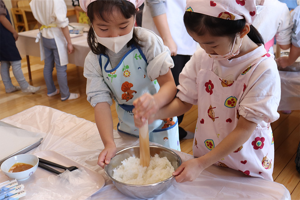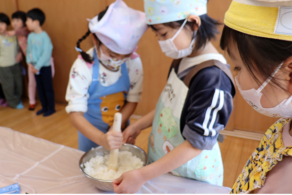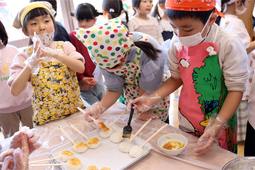 1月は五平餅作りで始まりました。栄養士の先生から作り方を聞き、ご飯をつぶして、丸くし、味噌だれをつけて給食室のオーブンでこんがりと焼き、みんなで美味しくいただきました。つづいて、新春コンサート。お歌やピアノ、トロンボーン、パーカッションの演奏に子どもたちも目を輝かせて聞き入っていました。