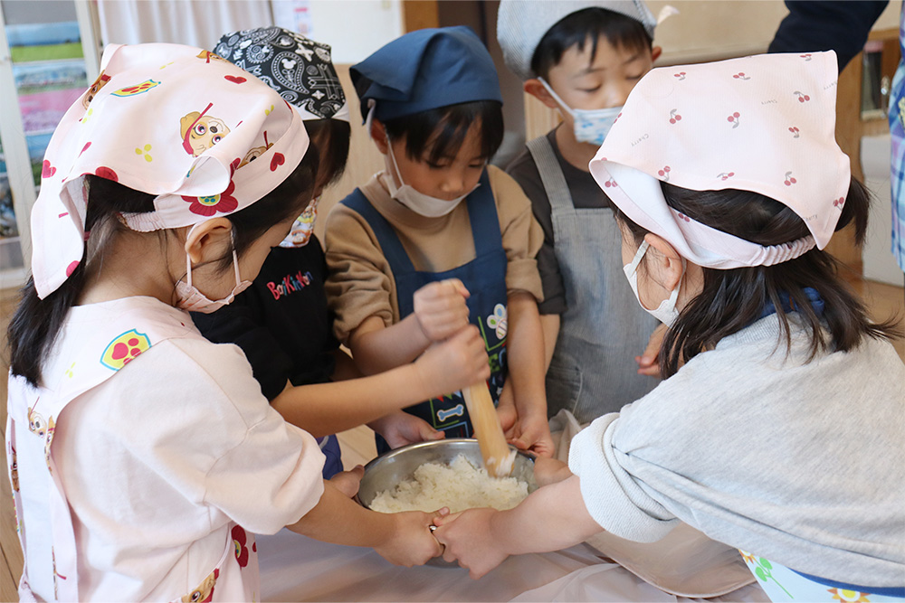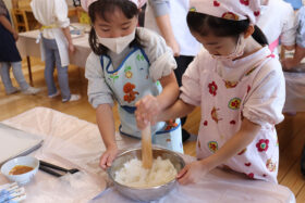 「五平餅ってなに?」から始まった子どもたち。森田先生から作り方を説明して頂き、いざ!始めにご飯を潰すのですが、なかなか潰れないご飯に一苦労。ボールを持つ人、潰す人、机を抑える人、子どもたち自身で役割を考えて力を合わせて頑張っていました。