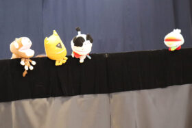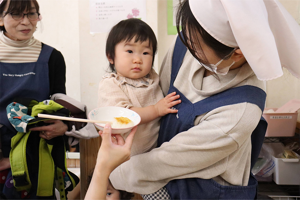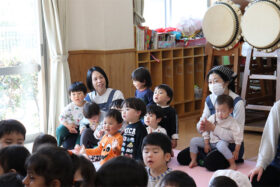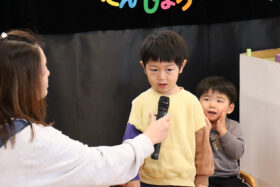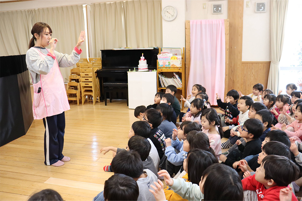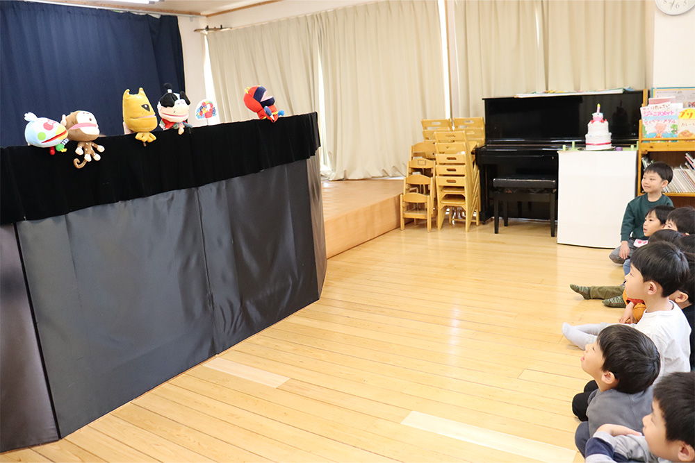 今月は全園児でお誕生日会を行い、先生たちからも演し物は「桃太郎」の人形劇でした。馴染みのあるお話ですが、可愛らしい動きのパペット人形に大喜びの子どもたち。鬼が来るシーンではドキドキした表情で見ていました。