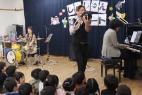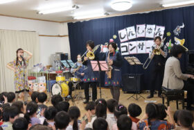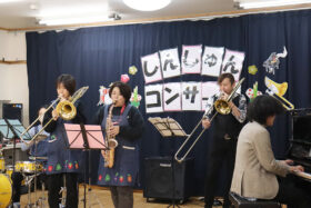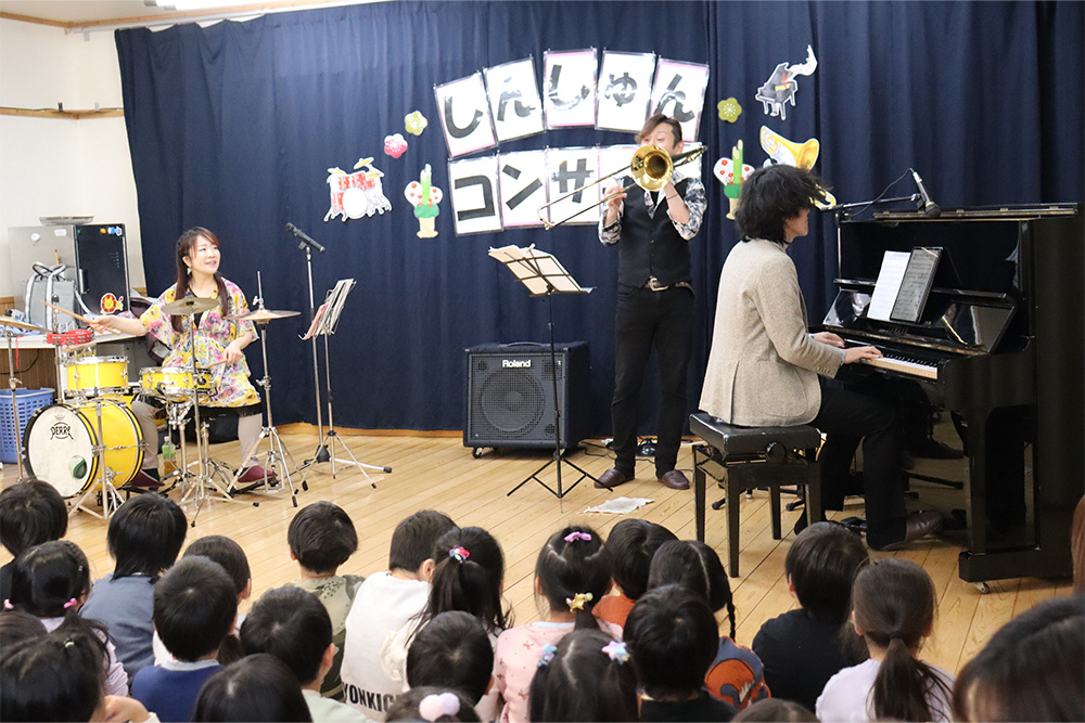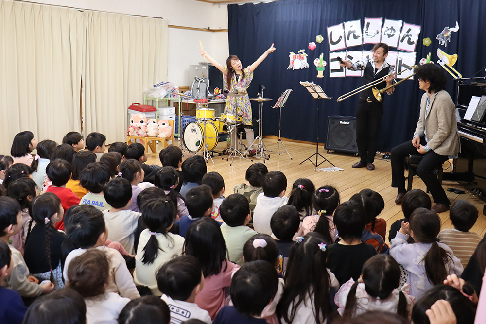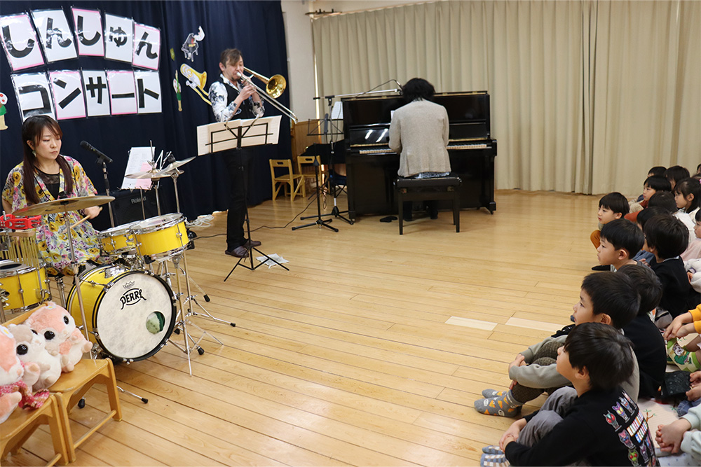 ピアノの演奏、トロンボーンやドラムなど様々なパーカッションの音色を間近で体感した子どもたち。アンコールでは職員も演奏に参加し、音色に耳を傾けたり、リズムに乗り、楽しそうな様子でした。素晴らしい生演奏に触れて、貴重なひと時となりました。