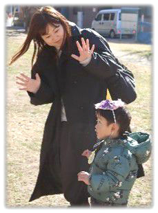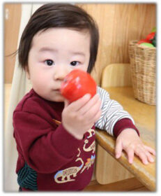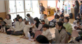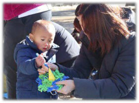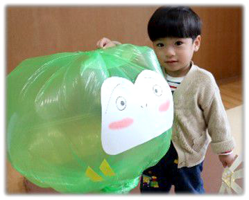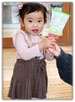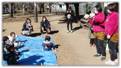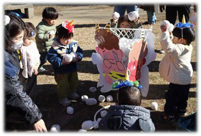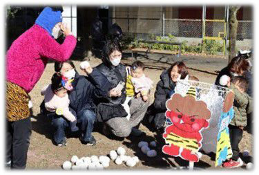 ヤダヤダ鬼・泣き虫鬼・怒りんぼ鬼・風邪ひき鬼に向かって、お母さんたちと「おには~そと~!」と白い玉を投げました。最後にオニが出てくる物語(桃太郎)の人形劇を楽しみました。