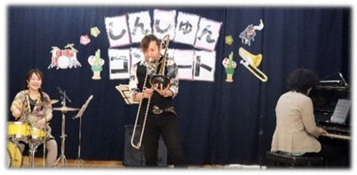 1月8日に本園のリトミック講師 あゆみ先生とゆかいな仲間たちによるコンサートを開催しました。ピンクパンサーやドレミのうた・ジッパ ディ ドゥ ダーなど楽しい曲を演奏してくれました♪在園児のもも組さんも参加して、アンパンマンを歌ってくれました♪
