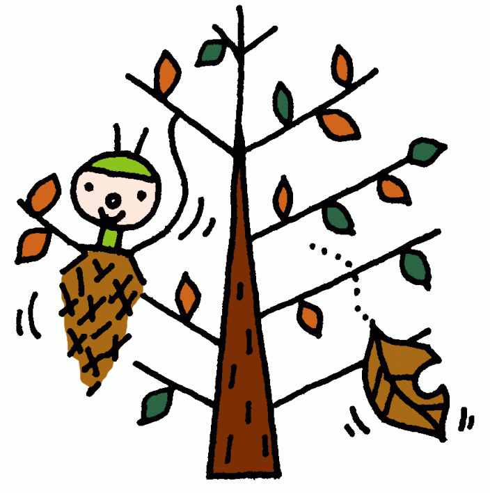 紅葉した葉っぱやドングリ拾い。拾った葉っぱで造形遊び(冠や人形などアイデアを出し合って作る)- 先月に続いて遊びます。拾った木の実(どんぐり)でヤジロベエや独楽を作ってみましょう。