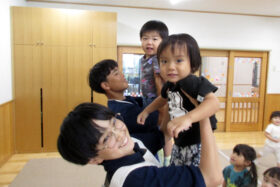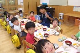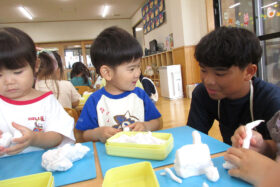 もも組さくら組2園すみれ組のクラスに入り、園庭での鬼ごっこやお部屋での粘土あそびを一緒にしてもらったり、給食やおやつも一緒に食べたり、とっても優しいお兄さん達で子ども達も大喜びでした。
