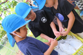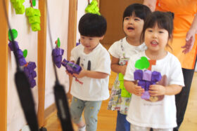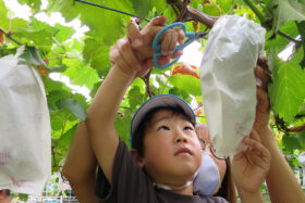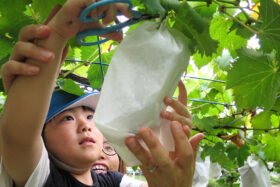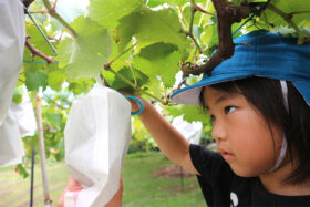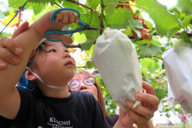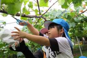初めて体験するお友達も多く、脚立に乗って、落とさないようにぶどうに手を添え、ハサミで茎を狙って…緊張の一瞬。チョキン! 小さな手でずっしりとぶどうの重みを受け止めると笑顔があふれるさくらさんでした。