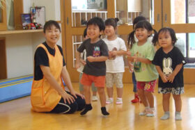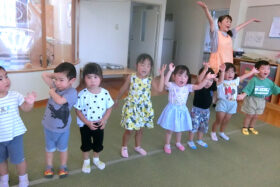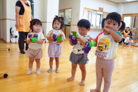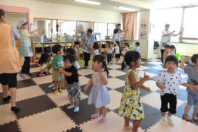 すみれさんはサビの歌詞を覚えて元気に歌いながら踊っています。つくしさんはすわって体を揺らしたり先生と手をつないで歩いたり、たんぽぽさんはフリを覚えて楽しく踊っています♪