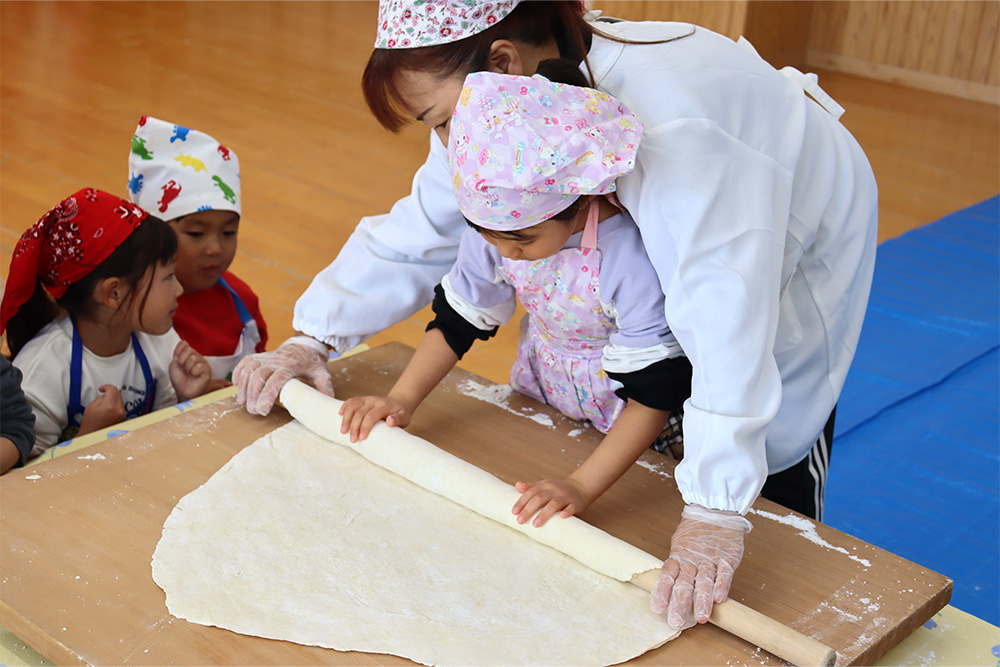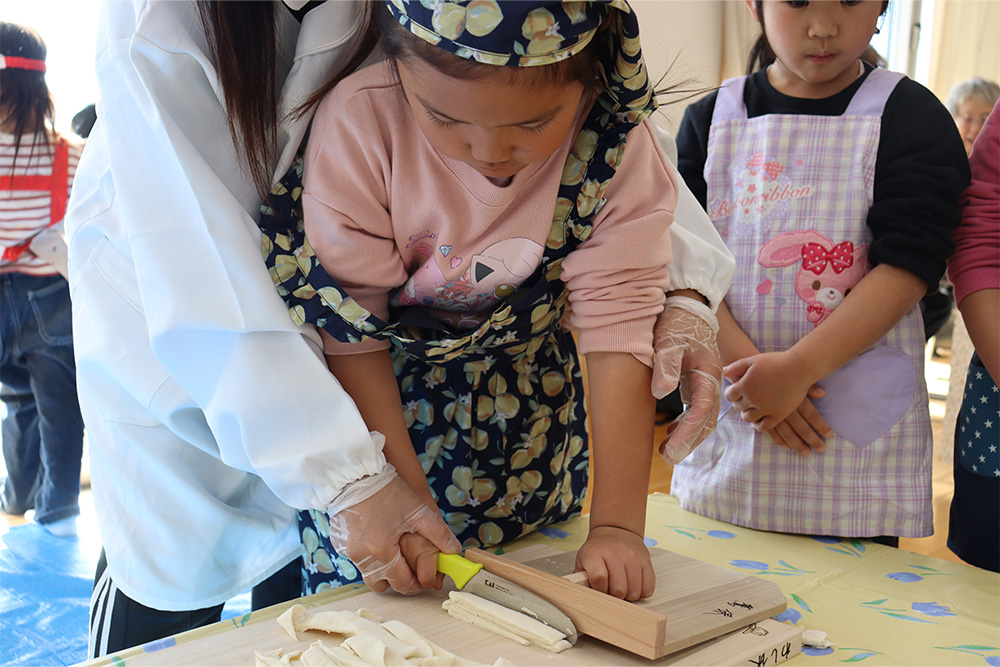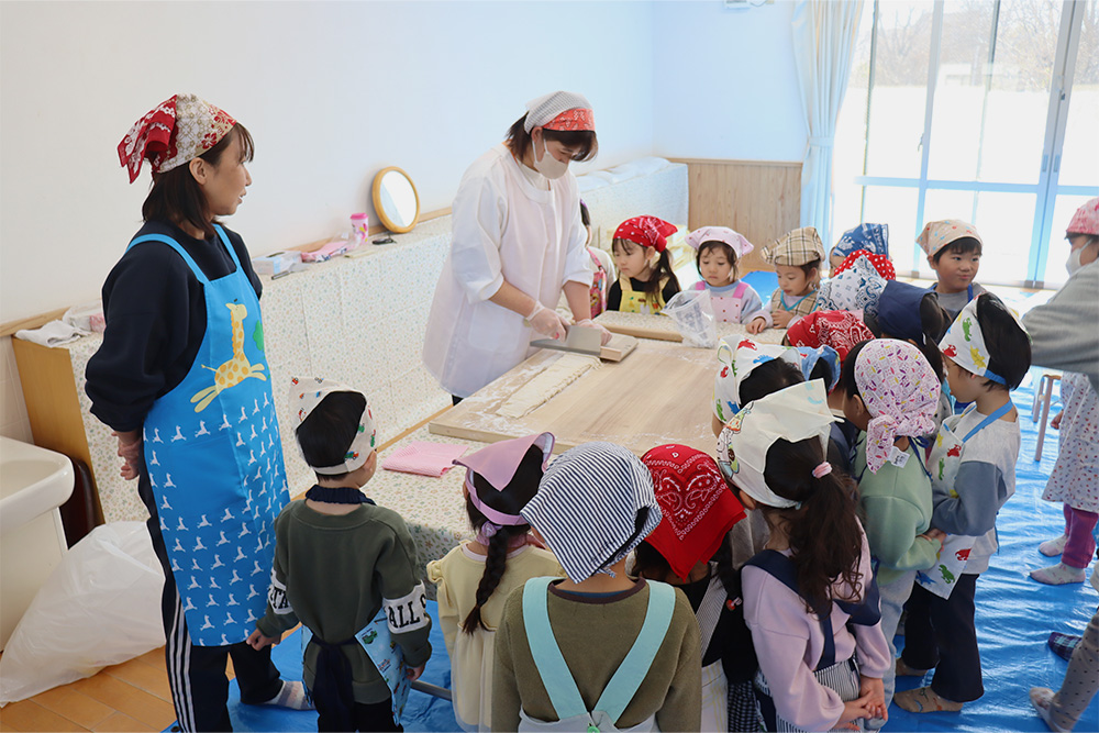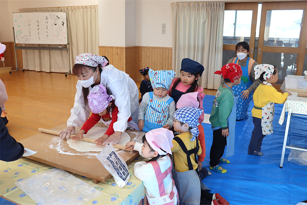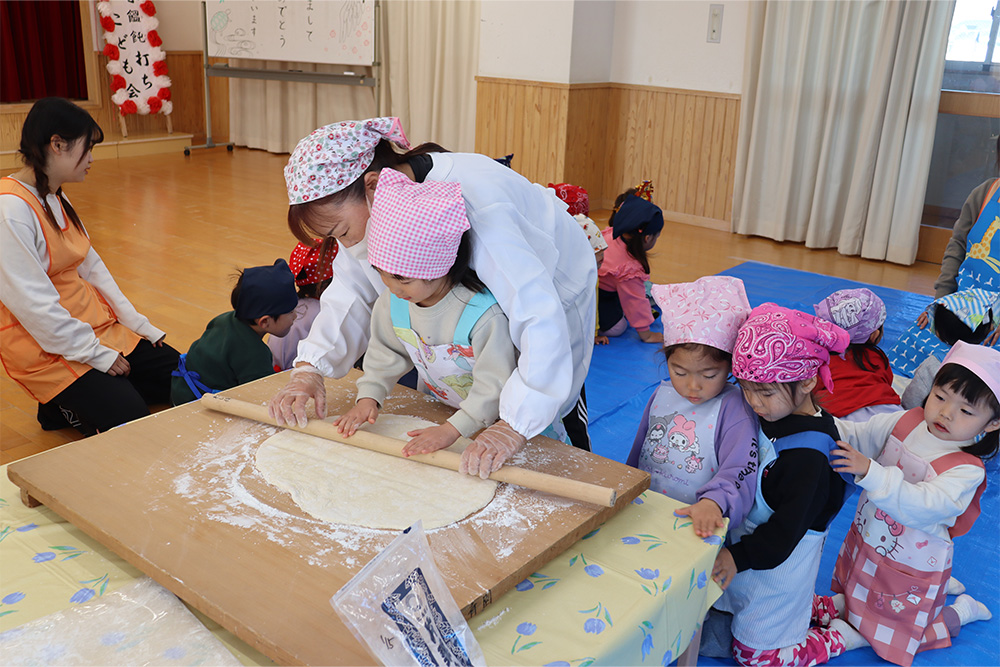 地域の方をお招きし、みんなでうどんを手作りする「新春うどん打ち大会」を行いました。子どもたちは、うどん玉をこねたり、足で踏んだり、麺棒で生地を伸ばしたりと、初めての体験に興味津々でした。仕上げは保育士が麺を切り、会場にはお正月らしく獅子舞の飾りも並び、にぎやかな雰囲気に包まれました。