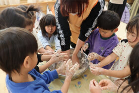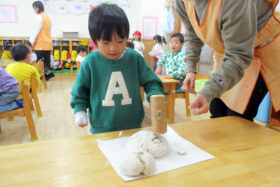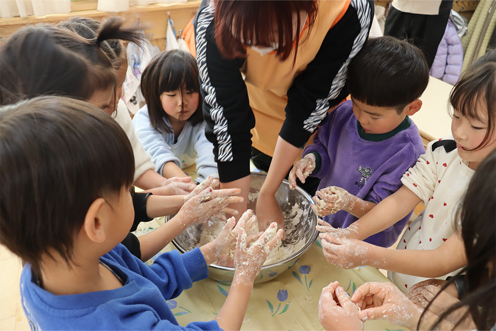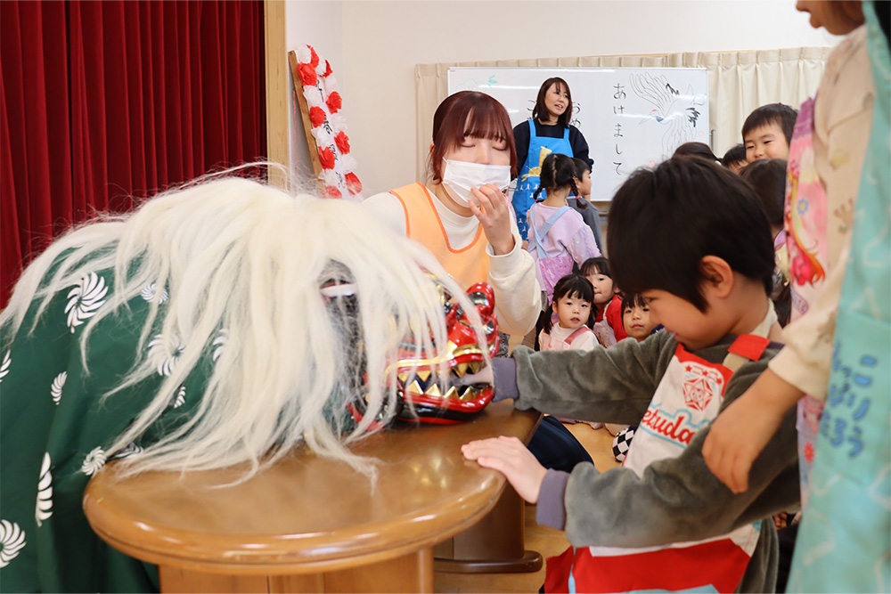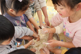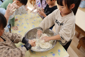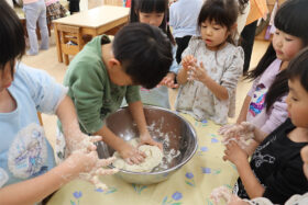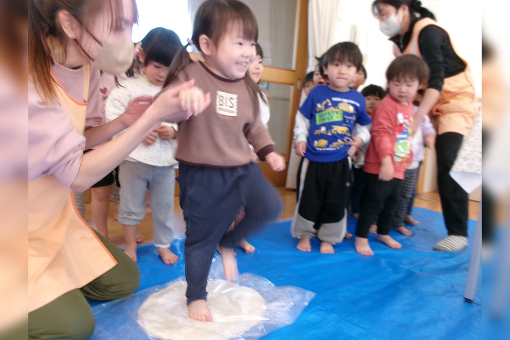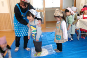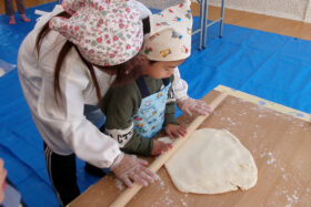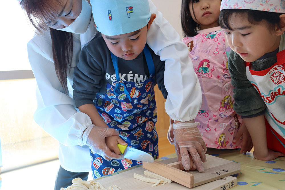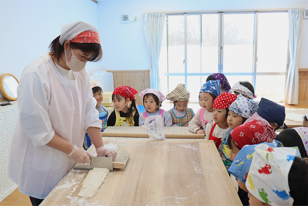 地域の方をお招きし、みんなでうどんを手作りする「新春うどん打ち大会」を行いました。子どもたちは、うどん玉をこねたり、足で踏んだり、麺棒で生地を伸ばしたりと、初めての体験に興味津々でした。仕上げは保育士が麺を切り、会場にはお正月らしく獅子舞の飾りも並び、にぎやかな雰囲気に包まれました。