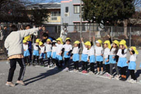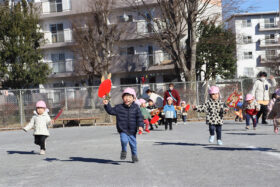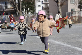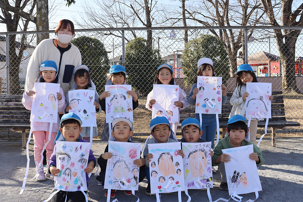 自分で作った凧を手に、園庭を元気いっぱいに走る子どもたち。凧が少しでも空に浮かび上がると、「あがった!」「みてみて!」と大きな歓声があがり、園庭は笑顔と声であふれていました。