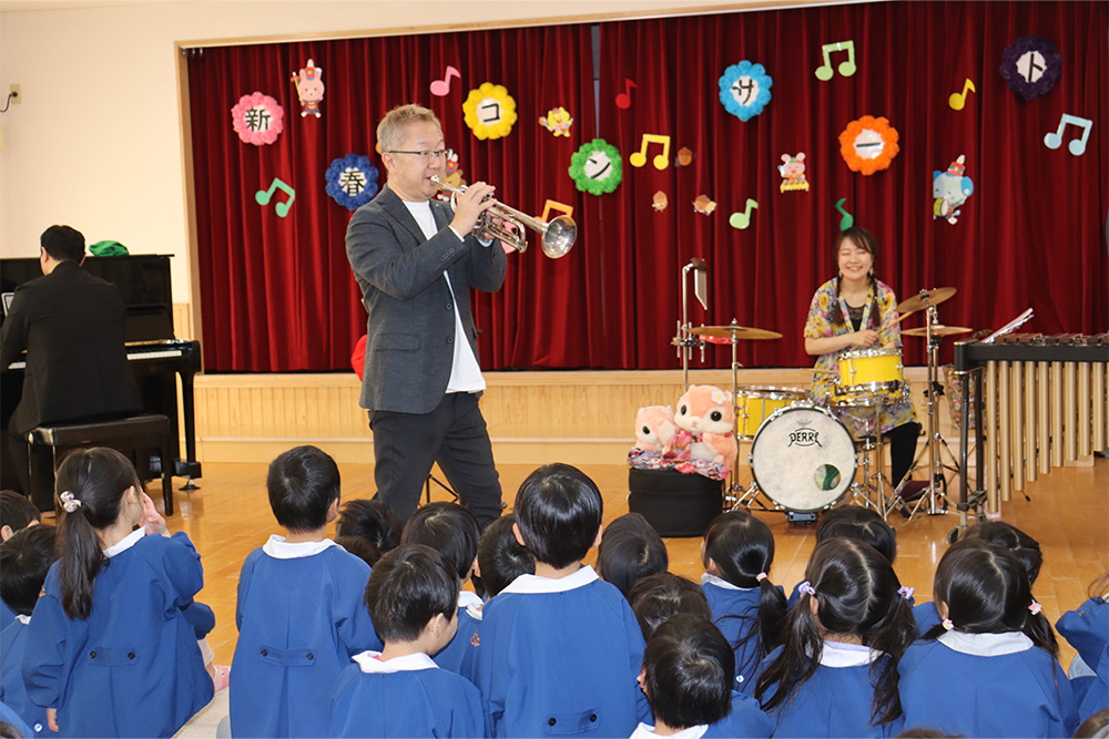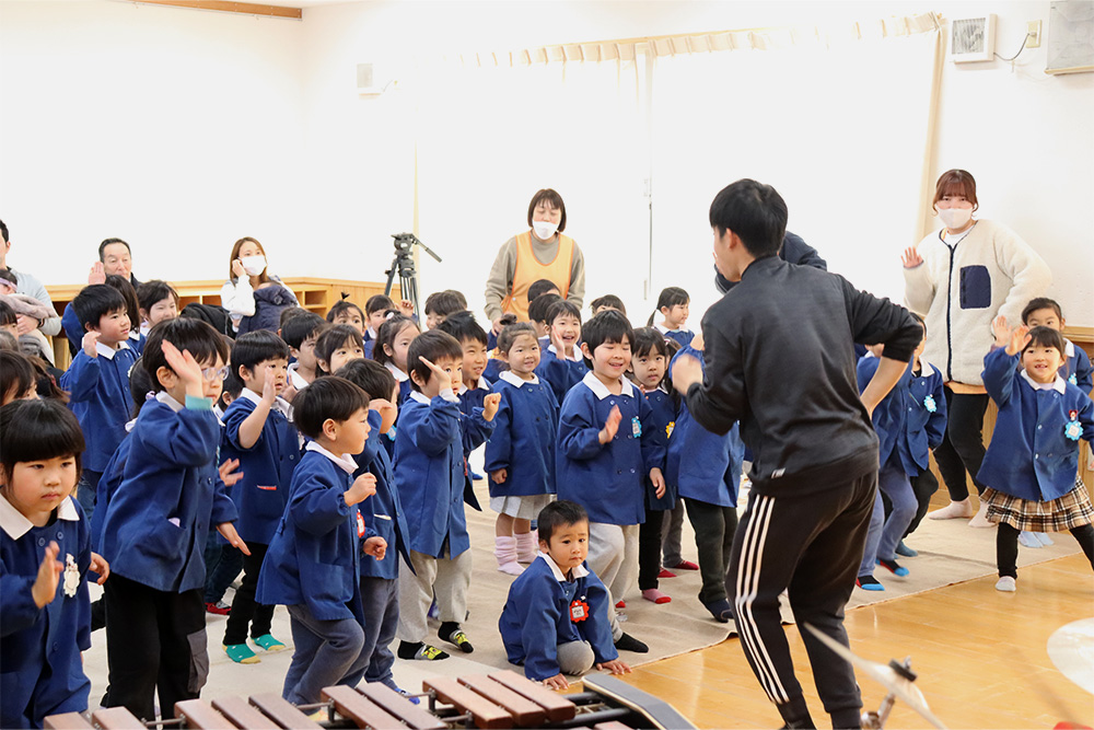 演奏は「スーパーマリオブラザーズ」のテーマから始まり、子どもたちの知っている曲や体が自然と動いてしまうような楽しい選曲に、会場はすぐに笑顔と歓声に包まれました。音楽に合わせて体を揺らしたり、手拍子をしたりと、子どもたちも思い思いに音楽を楽しんでいる様子が見られました。