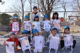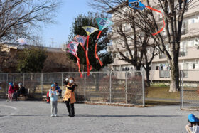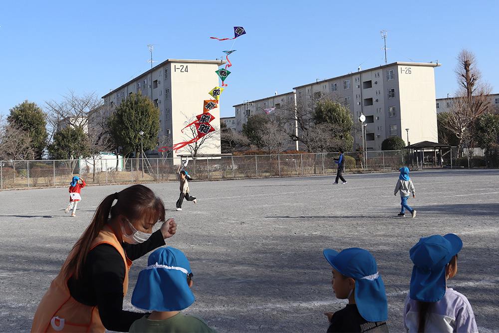 当日は、子どもたちの凧のほかに、ゲイラカイトや連だこも登場し、高く空に揚がる様子に、みんな大喜びでした。凧を見上げながら走る姿からは、寒さに負けない元気いっぱいの様子が伝わってきました。キンと冴えわたった冬の空気を感じながら、日本の伝統的な遊びに親しむ、季節を全身で感じる楽しいひとときとなりました。