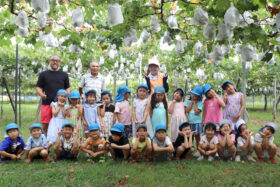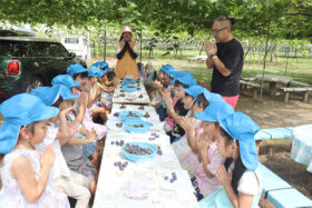 最初にぶどう園の方から、ぶどうの育ち方や収穫の仕方について、やさしくていねいに説明を受けました。子どもたちは真剣な表情で話を聞き、ハサミの持ち方や切るときの注意をしっかり覚えようと頷いていました。