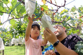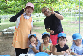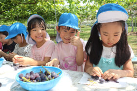 その後はいよいよ収穫体験。一人ひとりがハサミを手に、大きく実ったぶどうの房を慎重に切り取りました。「とれたよ!」「見て見て、こんなに大きい!」と嬉しそうに見せ合いながら、誇らしげな笑顔を見せていました。