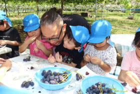 収穫したばかりのぶどうは、その場でみんなで頂きました。口に入れた瞬間「甘い!」「おいしい!」と歓声があがり、自然の恵みを味わう幸せに満ちたひと時となりました。