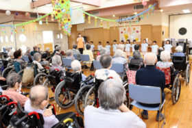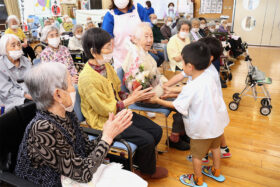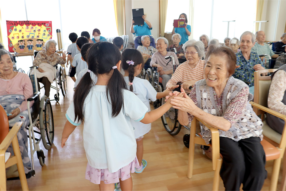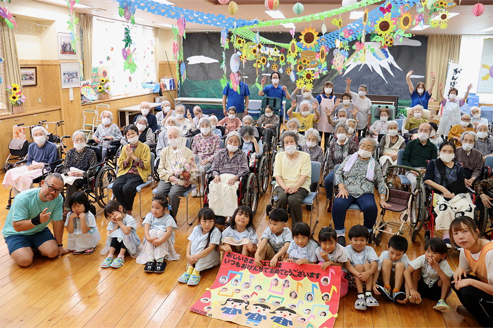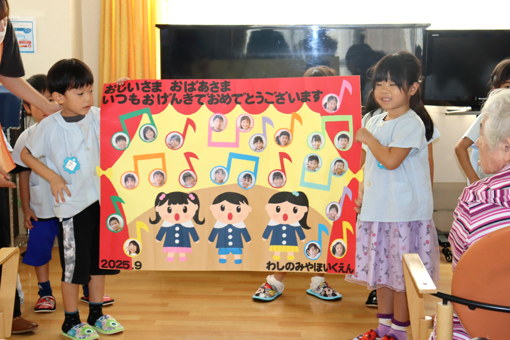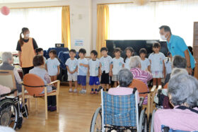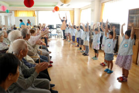 最初に子どもたちから、長寿をお祝いする言葉をお伝えすると、大きな拍手がわき起こりました。その後は、お年寄りの皆さんと一緒に秋の歌を歌ったり、手遊びを楽しんだりしました。歌声がホールいっぱいに広がり、自然と手拍子が起こる場面もありました。中には涙ぐみながら喜んでくださる方もいて、子どもたちの元気な声と姿が、大きな励ましになったことを感じました。