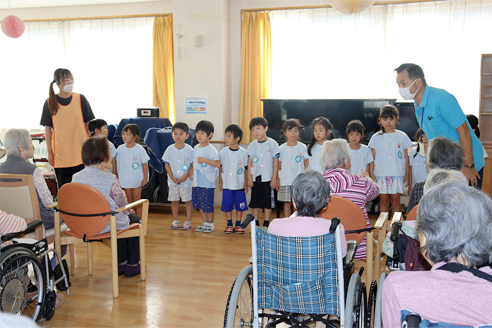 到着すると所長さんをはじめ、多くの職員の方々に温かく迎えていただき、ホールにはすでに大勢のお年寄りの皆さんが笑顔で待っていてくださいました。「ようこそ」「楽しみにしていたよ」と声をかけていただき、子どもたちも少し緊張しながらもうれしそうな表情を見せていました。
