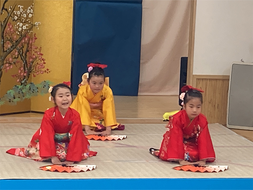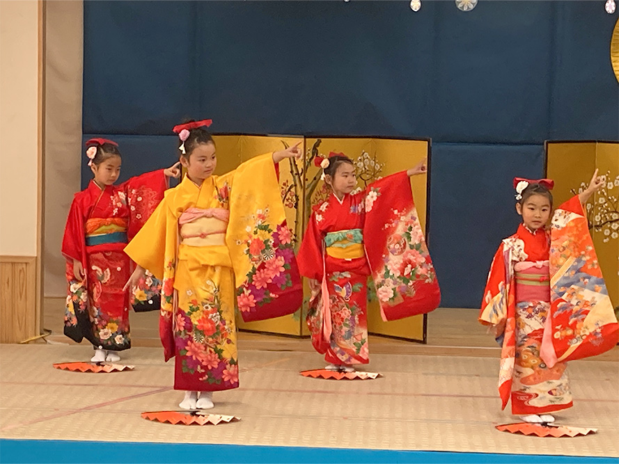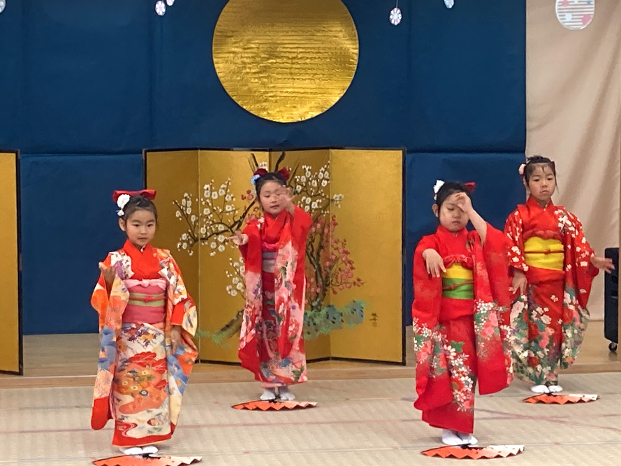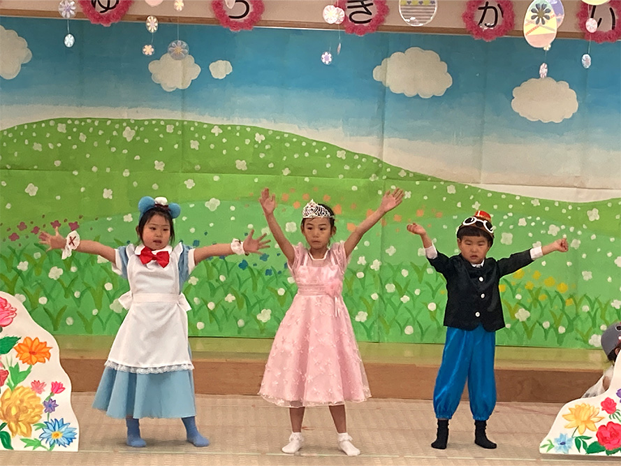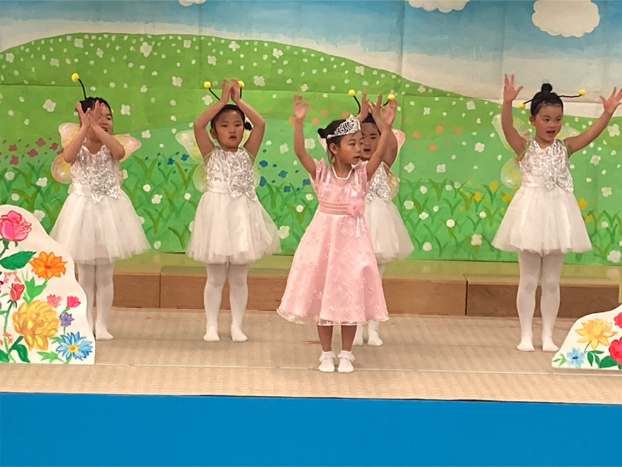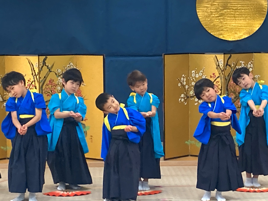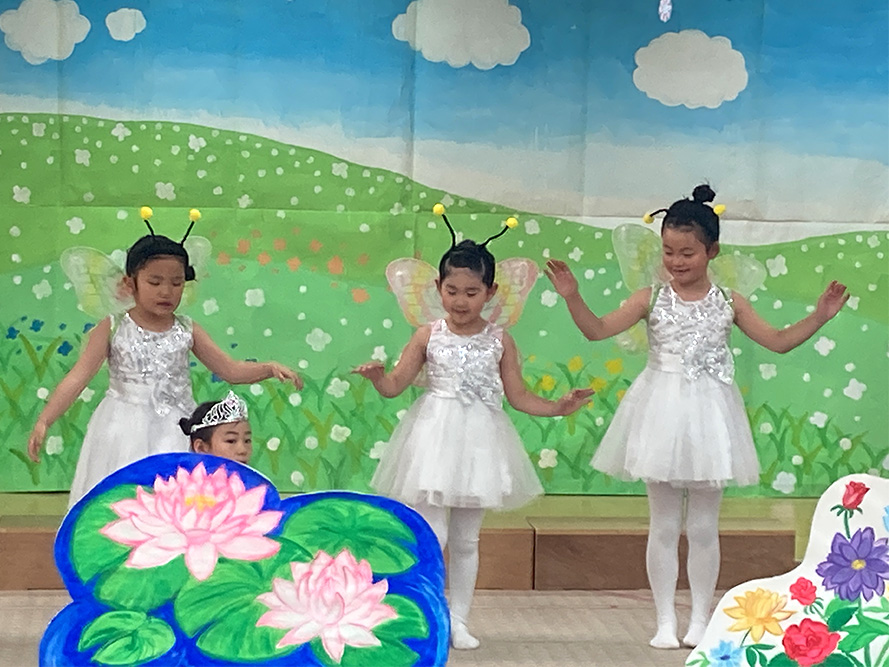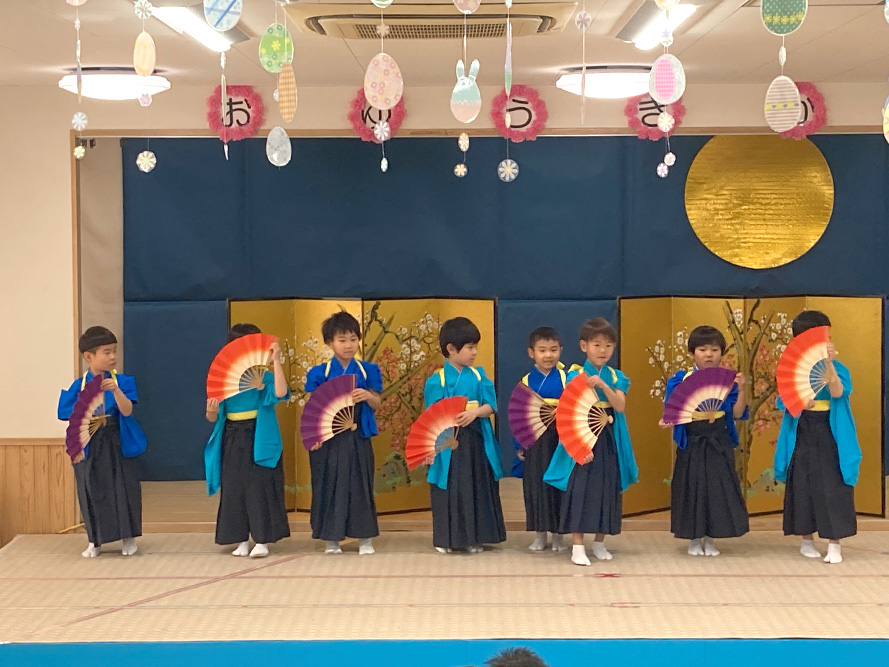 当日は、たくさんの保護者の皆様に見守られる中、子どもたちは少し緊張した様子を見せながらも、いざ音楽が流れると笑顔いっぱいに表現する姿がとても印象的でした。ダンスやオペレッタでは、可愛らしい動きや一生懸命な姿に、会場からは温かい拍手が送られていました。中でも、卒園を間近に控えたさくら組のお友だちは、日本舞踊やオペレッタ、合奏、言葉あそびなど、盛りだくさんの内容に挑戦しました。
