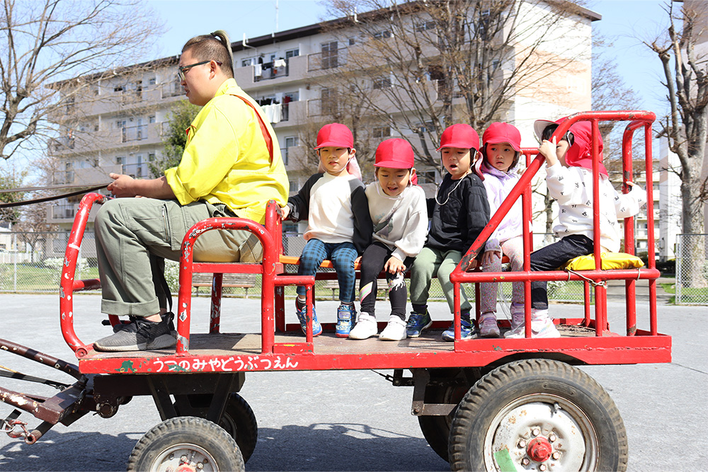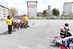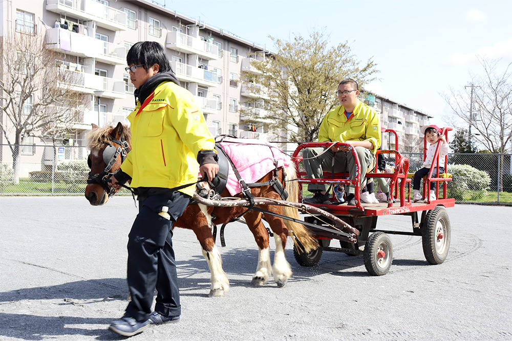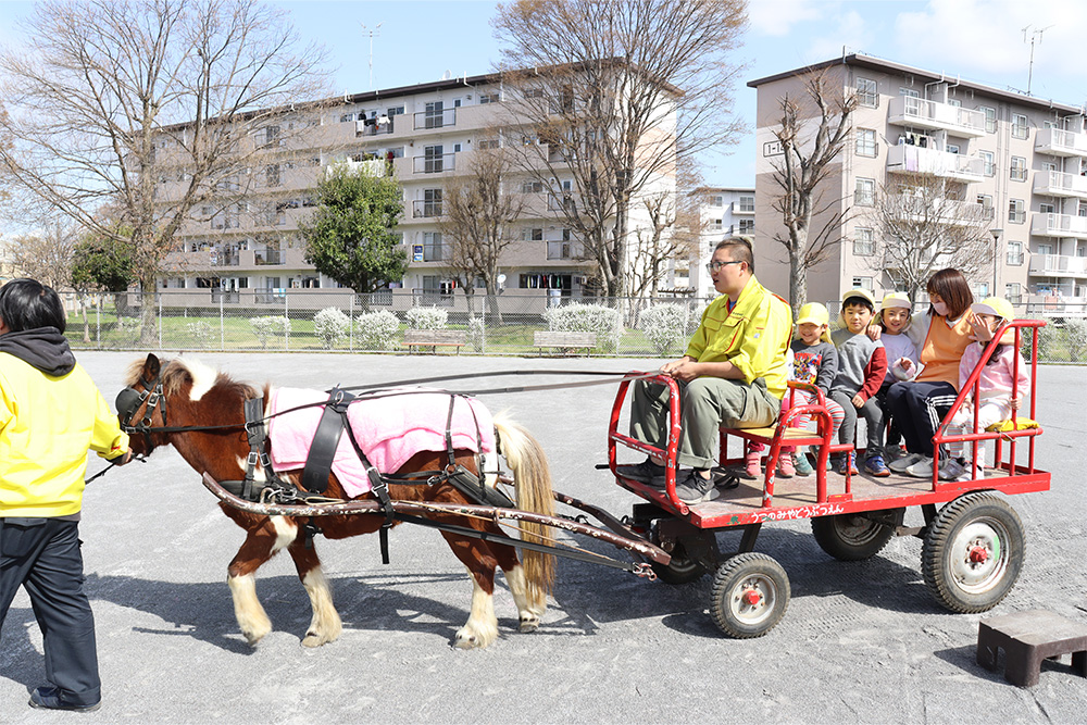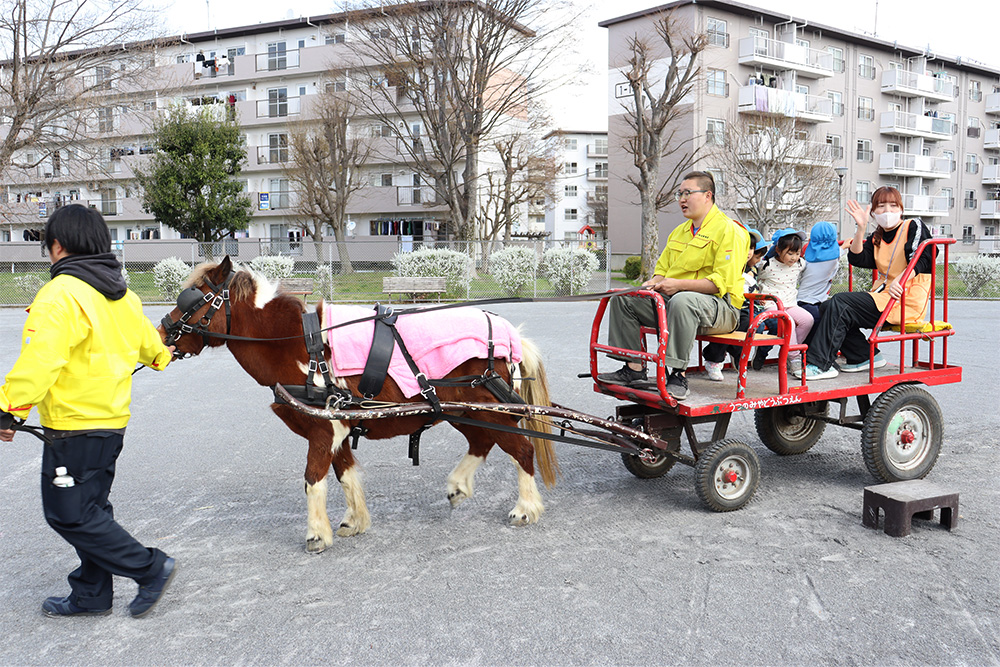 ふれあいの後は、ロバが引く馬車への乗車体験も行われました。普段はマラソンなどで親しんでいる運動公園を、ゆったりとした馬車で巡るという特別な体験に、子どもたちは大喜び。いつもとは違った景色に目を輝かせながら、楽しい時間を過ごしていました。