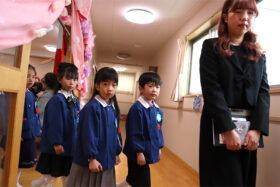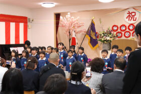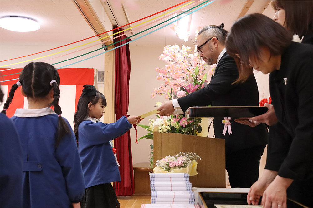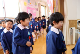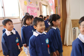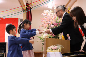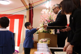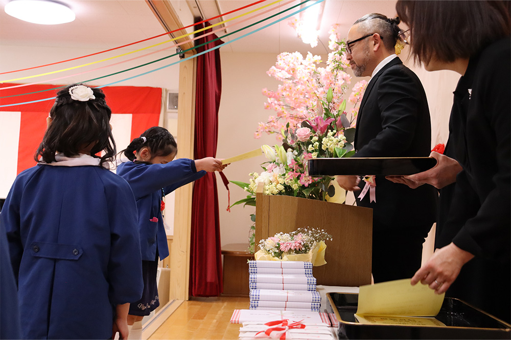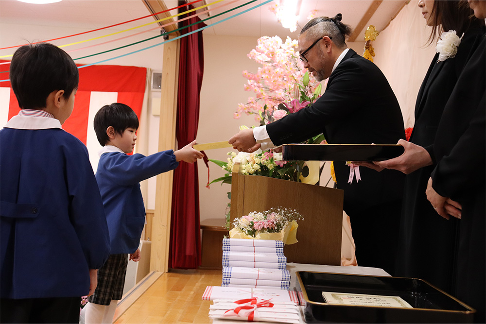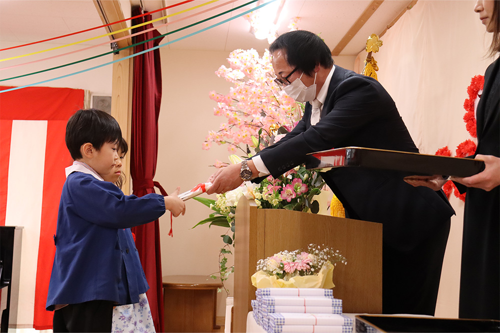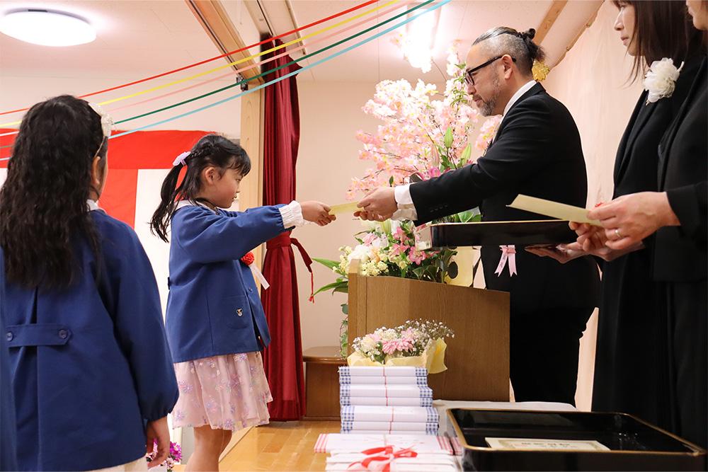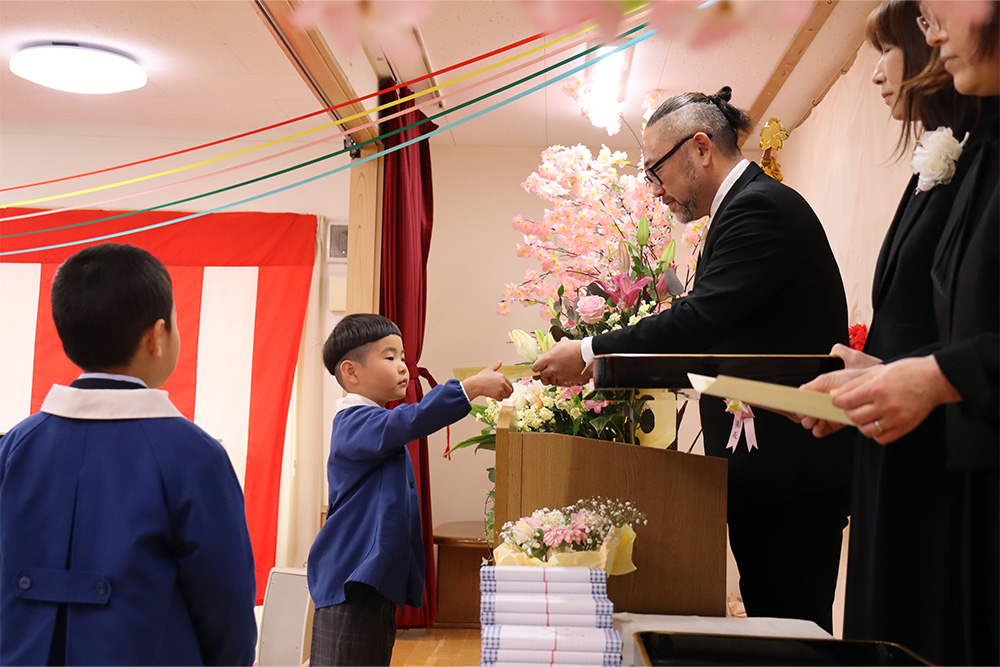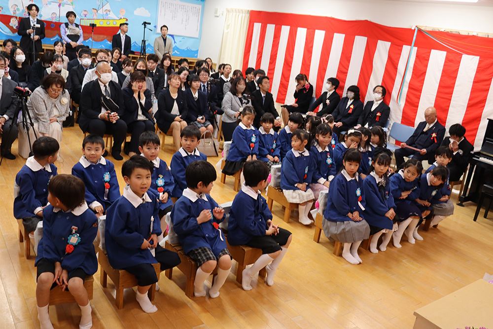 当日は少し緊張した面持ちながらも、一人ひとりがしっかりと前を向き、堂々と証書を受け取る姿がとても印象的でした。呼びかけの言葉も、これまでの練習の成果を発揮し、はっきりとした声で心を込めて伝えることができ、会場は温かな感動に包まれました。23名のさくら組の子どもたちが見せてくれた立派な姿に、大きな成長を感じるひとときとなりました。